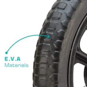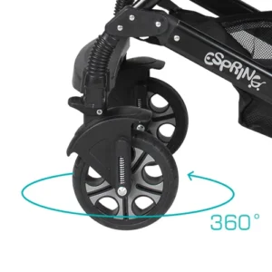 • چرخ‌های EVA بادوام: چهار چرخ از جنس EVA با مقاومت بالا، حرکت روان و بی‌دردسری را در انواع مسیرها فراهم می‌کنند. دو چرخ جلویی قابلیت چرخش ۳۶۰ درجه دارند که کنترل کالسکه را بسیار راحت‌تر می‌کند.